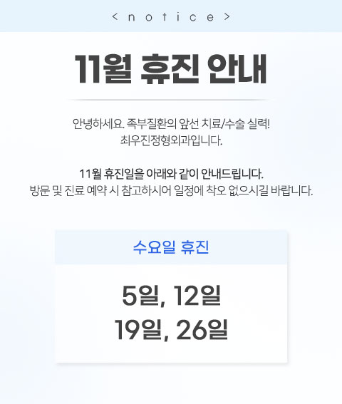 안녕하세요. 발/발목 질환 치료 및 수술에 새지평을 열어가는 최우진정형외과입니다.