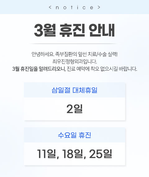 안녕하세요. 발/발목 질환 치료 및 수술에 새지평을 열어가는 최우진정형외과입니다.